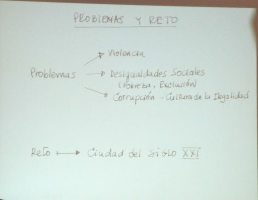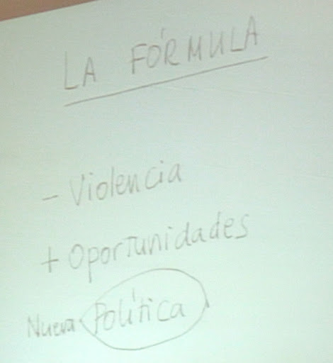 Here Dr. Fajardo relied on his mathematician background: he gave us an equation. Lowering violence and creating opportunities will bring about a new politics, a new way of life. He repeatedly cautioned that change would not happen overnight, that there would be major setbacks and backlashes along the way. But, step-by-step, we could reverse the downward spiral and begin rebuilding our societies.