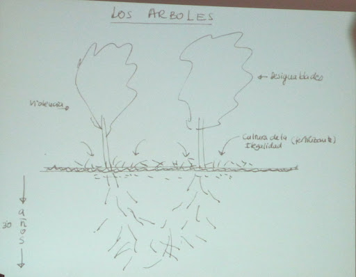 There are two trees: one tree represents violence, the other social inequity. The trees grow in well-fertilized soil: in a culture of illegality. The two trees have been growing close together, in such fertile soil, for so many years that their roots are completely intertwined. It is hard to distinguish, from the roots, where one tree begins and the other ends; they grow almost as if they were one tree.