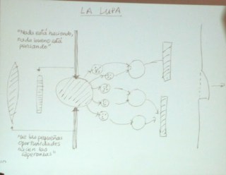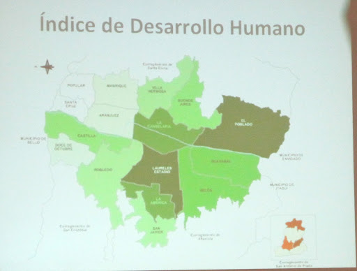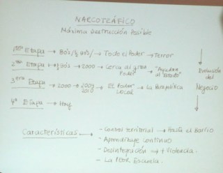 Dr. Fajardo used this slide to illustrate how one powerful man (his name was never spoken, sort of like Voldemort ☺ ) had complete control, terrorizing the people, in the 80s and the first half of the 90s. There was control of territory “hasta el barrio.” There was continuous apprenticing and tutoring of new drug dealers, a clear “management development” plan, if you will. By the latter half of the 90s, though a criminal, this man was very near power; he was “helping the state.” He wanted to be president. But from 2000 through 2009/10 the tide turned toward local power, toward participatory politics. And, today, while there remains much progress to be made, people go out in the streets again.