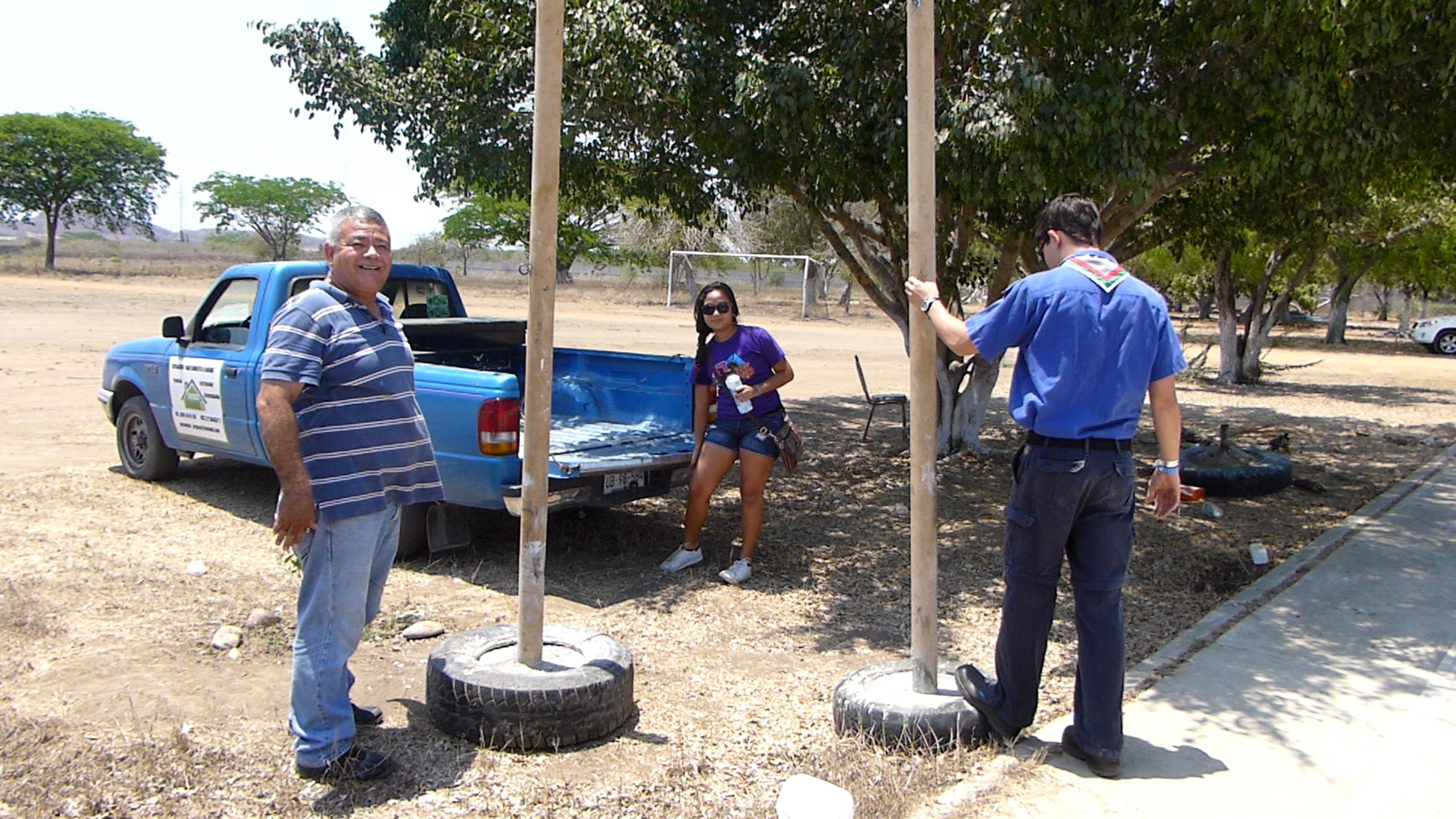 The cemented poles for the volleyball court