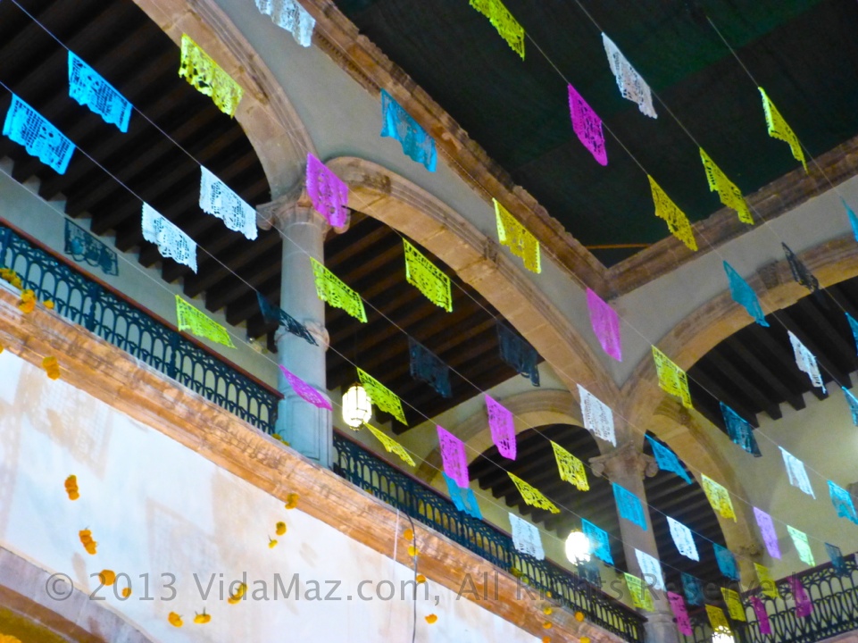 Papel picado hanging over the altar, from the second floor ceiling