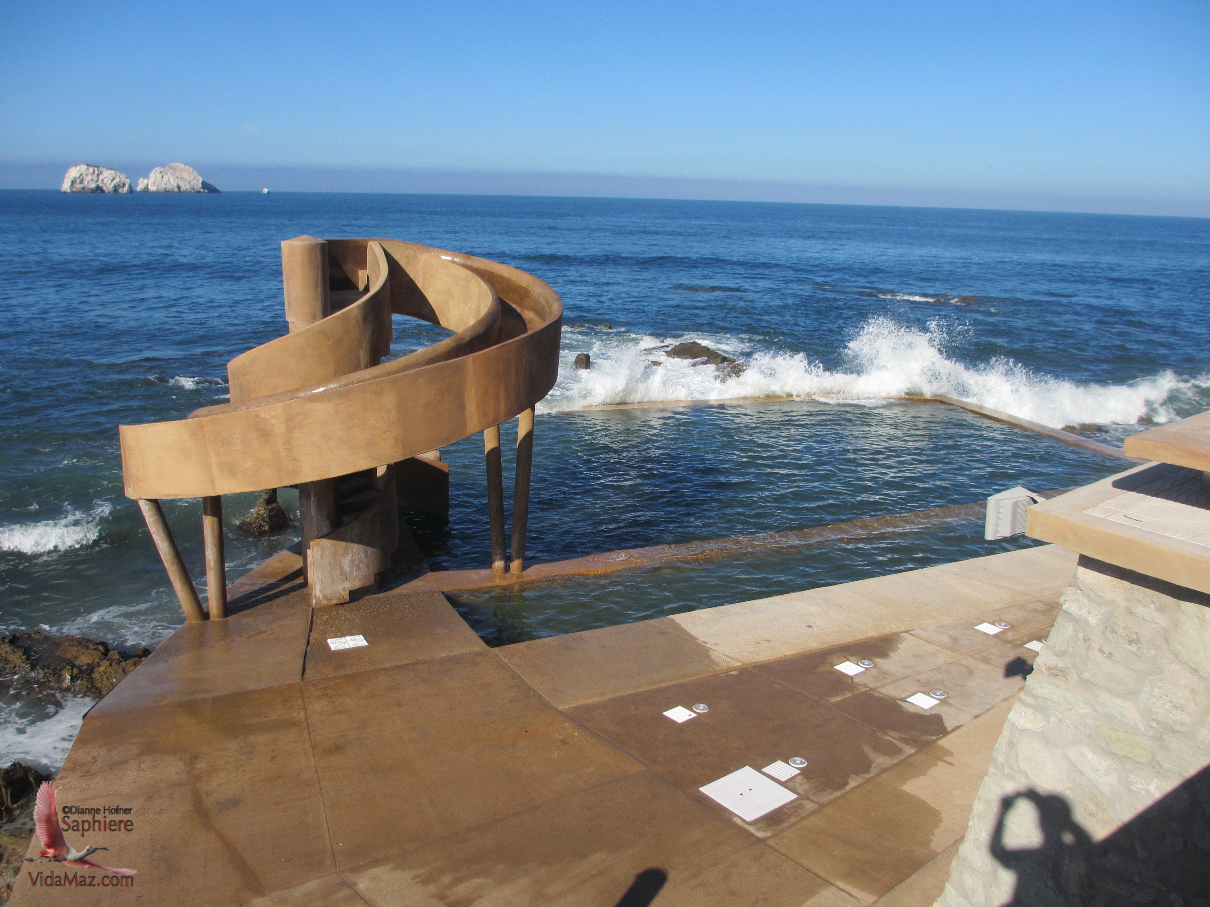 It’s said that New South Wales has over 100 ocean-fed pools. A humpback whale was even found dead in one of the pools in Sydney; see the video below. Outside of Australia, however, ocean water pools are few and far between. That’s what makes Carpa Olivera so unique—a touristic feature we should tout loudly! The Carpa Olivera restoration, in my opinion, puts Mazatlán ahead of leading tourist destinations such as San Francisco—where I’ve long wondered why someone doesn’t restore the historic Sutro baths, and Honolulu—where the Waikiki Natatorium remains a ruin. Especially a shame, since the natatorium was built as a war memorial in 1927! Click on a photo below to enlarge it or view a slideshow.