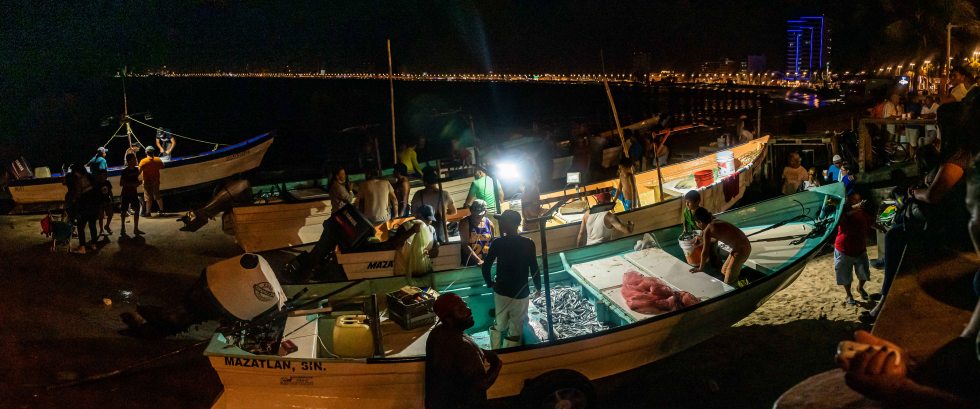 Like most anything in Mazatlán, this is a family affair: grandparents, kids… Smiles and joking abound; everyone is happy. Entire extended families camp out on the malecón and the beach, watching the activity and enjoying the scene. It reminds me of festival season in Japan, and I love it! It’s a wee bit dangerous getting a nice camera and flash setup in amongst the boats, what with the tide coming in fast at our feet, causing the pangas to move every which way, the huge crowds of people pushing for the best catch and the fishermen grabbing at the bills flying their way.