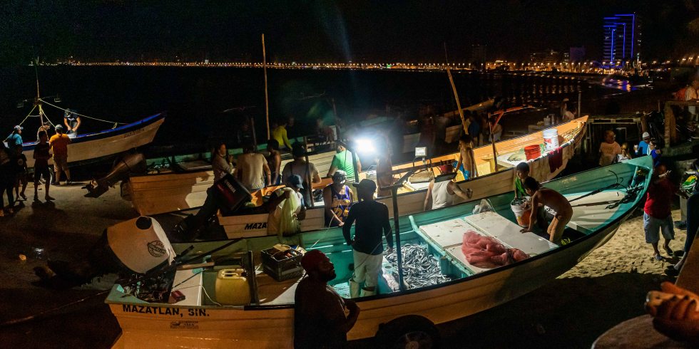 Like most anything in Mazatlán, this is a family affair: grandparents, kids… Smiles and joking abound; everyone is happy. Entire extended families camp out on the malecón and the beach, watching the activity and enjoying the scene. It reminds me of festival season in Japan, and I love it! It’s a wee bit dangerous getting a nice camera and flash setup in amongst the boats, what with the tide coming in fast at our feet, causing the pangas to move every which way, the huge crowds of people pushing for the best catch and the fishermen grabbing at the bills flying their way.