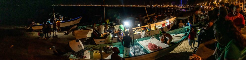 Like most anything in Mazatlán, this is a family affair: grandparents, kids… Smiles and joking abound; everyone is happy. Entire extended families camp out on the malecón and the beach, watching the activity and enjoying the scene. It reminds me of festival season in Japan, and I love it! It’s a wee bit dangerous getting a nice camera and flash setup in amongst the boats, what with the tide coming in fast at our feet, causing the pangas to move every which way, the huge crowds of people pushing for the best catch and the fishermen grabbing at the bills flying their way.