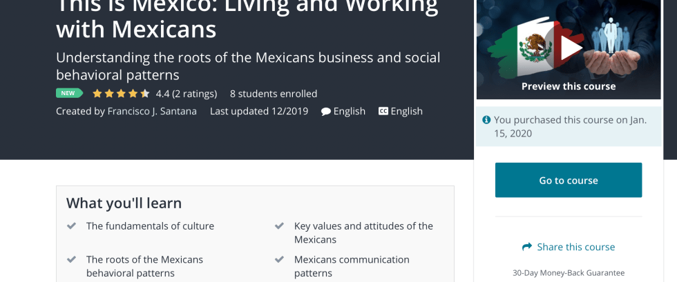 I have just taken the course and believe it is a very worthwhile way to spend an hour or two. It communicates to the learner some of the fundamental concepts of intercultural communication in a simple, clear, affordable and easy way. Francisco covers a lot of territory, summarizing key things to remember concisely. He is careful to say things like, “generally speaking” or “Mexicans have a tendency,” in order to avoid stereotyping and overgeneralizing the huge diversity that is this country.