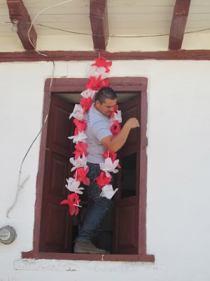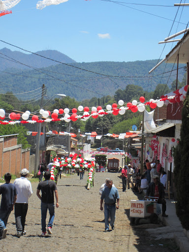 When we arrived in town, about 11:00 am, people were just putting the finishing touches on some decorations. Those included assembling beautiful red-and-white-arches in the center of the street, in front of each of the barrios of Santa Clara del Cobre.