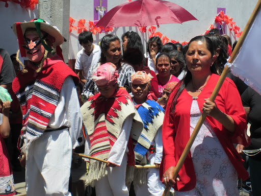 The procession is lead by a maestro, in this case Bernardo, who played flute, as well as by a local man who leads the prayers at each of the Stations of the Cross. This gentleman would kneel down with Bernardo in front of the cross, exhibiting incredible focus despite the chaos going on around him. He and a small group of church members would recite the prayer for that Station after walking around the cross and the statue several times. The Marías follow and surround the Jesus statue, accompanied by some key members of the parish with their prayer books, people holding flags representing major church events such as Guadalupe Day, and church elders carrying other holy relics. The Marías remove the thorned crown on Jesus’ head, wipe his brow, and replace it. Other Marías throw flower petals (representing divinity and life) at the statue at each station, while the main María cleans the petals off. The by now hundreds of dancing Judíos surround all of this, dancing and creating mayhem on the perimeter. This is all in turn surrounded by hundreds of spectators, sitting or standing along the church walls and the KONTI route.