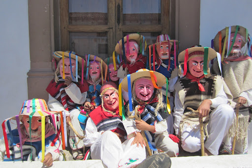 I put some of my video footage together into an 11 minute movie, and I’d like to invite you to pour a cup of something, sit back, put it on full screen, and take a look. I find these people such great role models. Watch how they involve and educate their kids, rarely needing to correct them. Most of these kids are dancing for seven to eight hours straight—all day long, under the hot sun. They are wearing hand-carved wooden masks, heavy carrilleras or bamboo skirt-like percussion instruments, and tenabaris or pebble-stuffed butterfly cocoons wrapped around their legs. They wear handprinted or embroidered white manta clothing and cape, and simple huaraches on their feet. Some boys may not have all these things, and may have to improvise: I saw several tenabaris made out of recycled soda cans, for example, and some kids wearing jeans.
