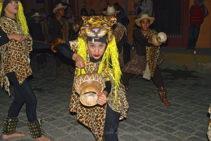 The second dance group of the evening were the teenagers who performed the Danza del Jaguar, native to Cosalá. The young men act as hunters, while the young women act the role of jaguars, hiding, running from, and occasionally leaping at the young men. They play these terrific instruments called rotares: hollow so they’ll reverberate, with a leather cord attached that is pulled to create the sound of a jaguar roaring. Accompanying the dancers was a small band, in the back of a pickup truck, with several drums, more rotares, and other percussion instruments. This group walked immediately in front of the Virgin, and we were told that their dance clears the way of any bad spirits, cleansing and purifying the route for today’s honored guest.