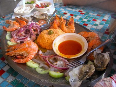 We sampled two things we’d be hard-pressed to find elsewhere. Greg had dorado/mahi mahi served over a grilled pineapple slice and covered with poblano sauce, and I had a dorado filet covered with seafood and a coconut cream curry. There was so much food that I ended up bringing half home with me, but never ate it for cena as I was still full!